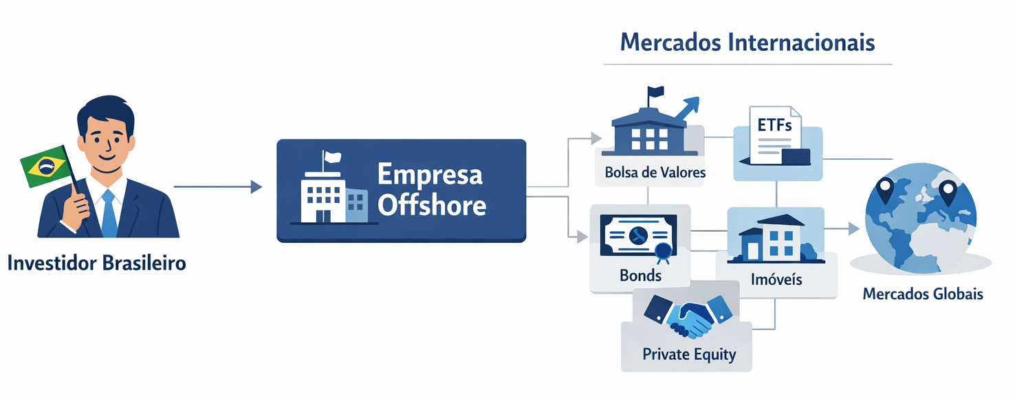 Pense na offshore como um CNPJ internacional. Ela é a entidade jurídica que irá: