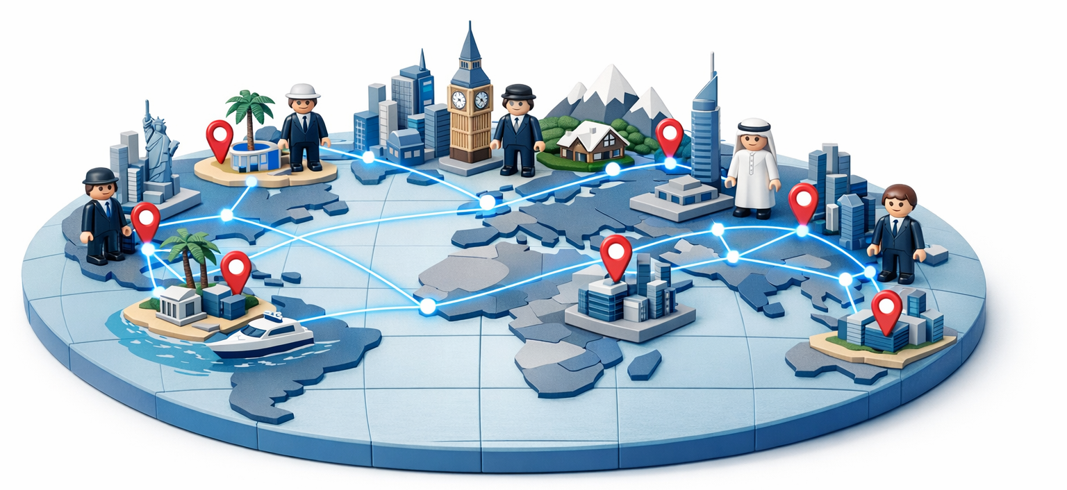 O patrimônio geralmente fica em centros financeiros estabelecidos, não necessariamente na jurisdição da offshore: